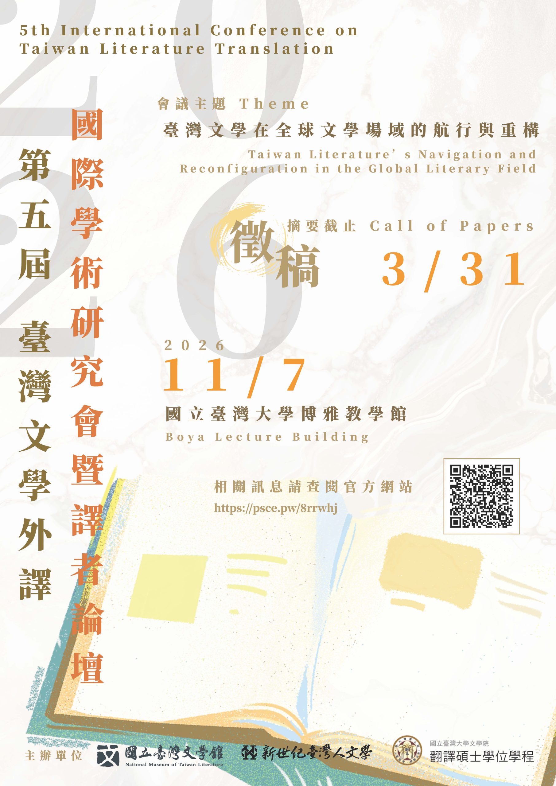 會議宗旨:邁入2026年,21世紀已悄然走過四分之一。自2003年國立臺灣文學館成立以來,臺灣文學外譯事業亦逐漸展現出不同於上個世紀的新風貌。以早期行政院文化建設委員會(現文化部)推動的「中書外譯計畫」為起點,臺灣文學外譯歷經從單向文化輸出,到逐步進入國際主流學術與出版體系的發展歷程。