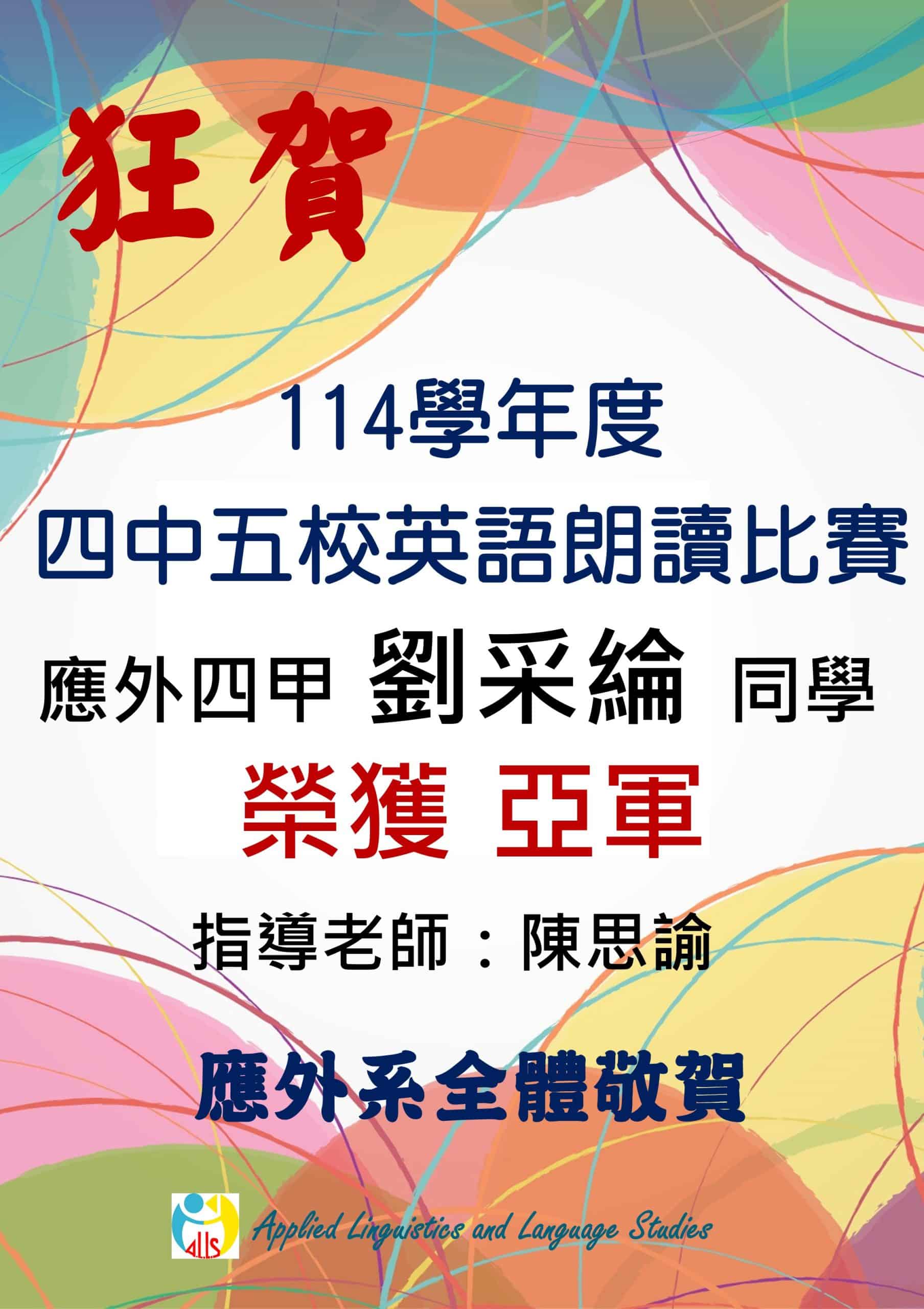 狂賀!! 應外四甲 劉采綸 同學114學年度四中五校英語朗讀比賽榮獲 亞軍