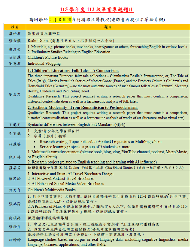 115學年度112級畢業專題題目如圖所示,請同學於5月8日前自行聯絡指導教授,老師們會再提供名單給系辦。
