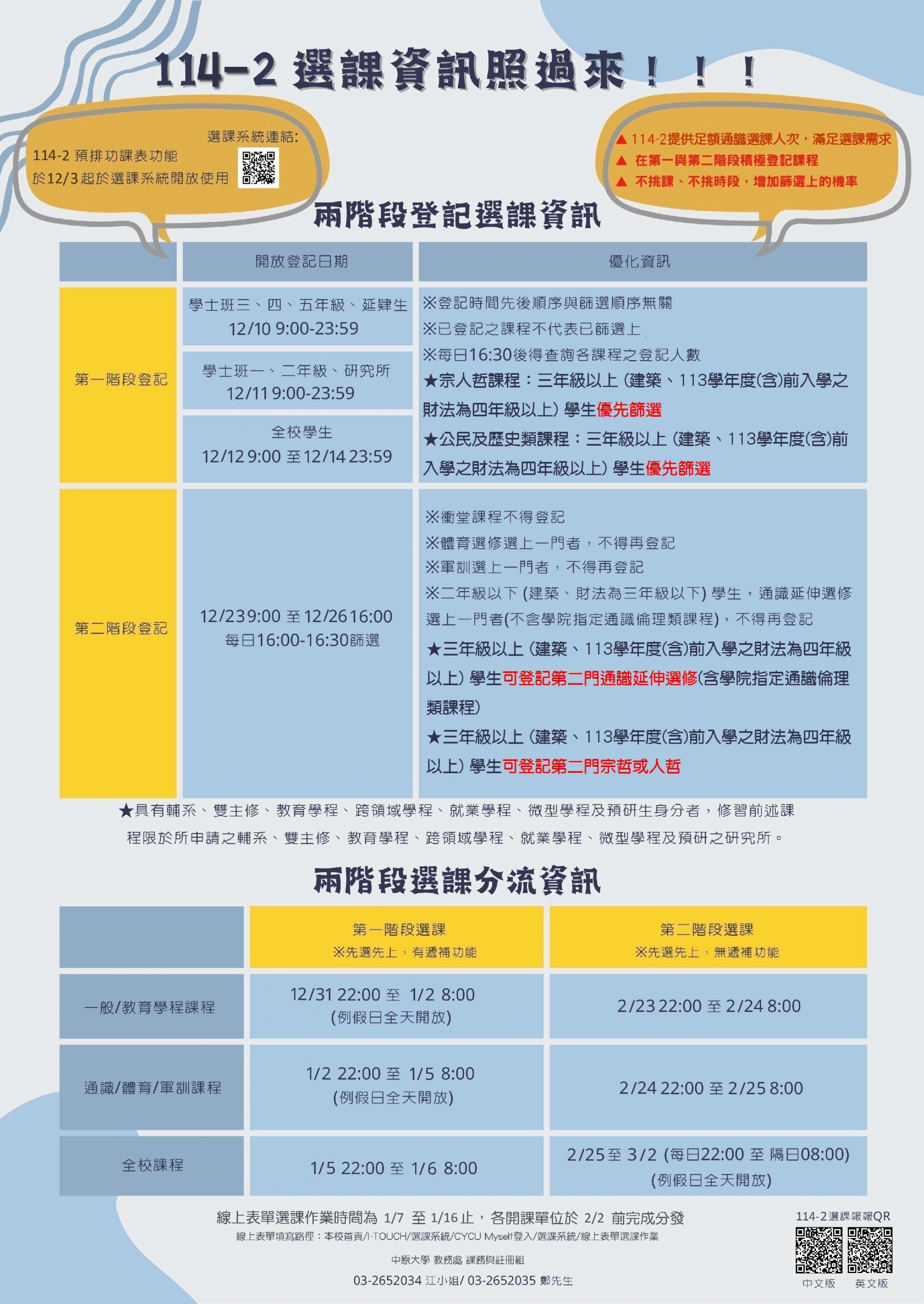 三、選課期間為114年12月10日起至115年3月2日止,各階段日程詳見「選課報報-選課日程表」,注意事項如下: