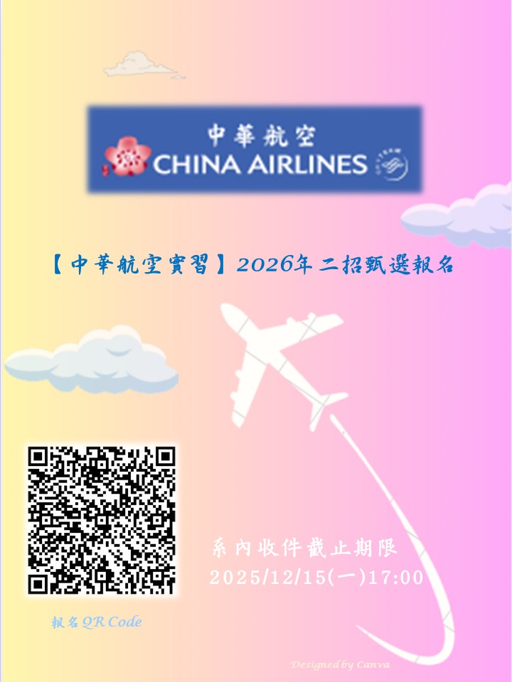 【中華航空】2026年實習生二招甄選報名事宜公告(系內收件截止日2025/12/15<一>17:00)