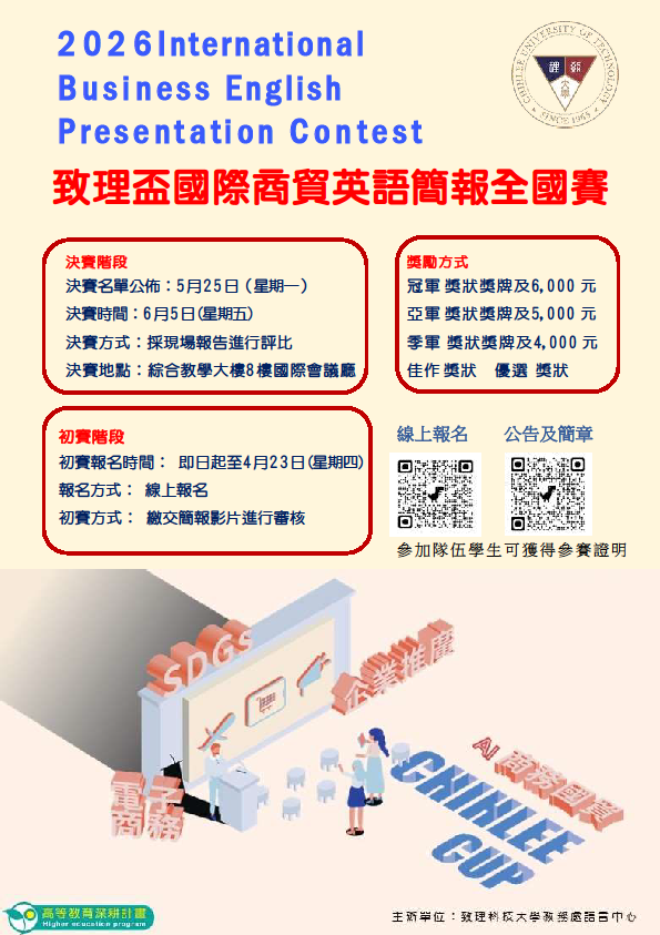 【2026致理盃國際商貿英語簡報競賽】歡迎有興趣的同學踴躍報名參加!