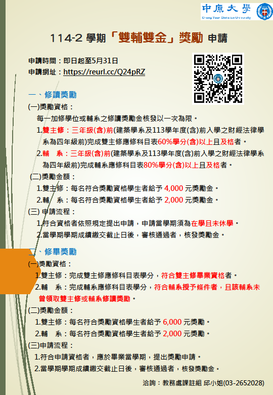 114學年度第2學期「雙輔雙金」獎勵申請公告