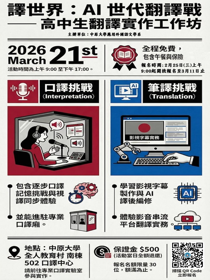 【2026年中原大學應外系中英口筆譯體驗營-「譯」世界: AI 世代翻譯戰】2月25日上午9:00起開放報名至3月11日止,歡迎在學高中生踴躍報名參加!