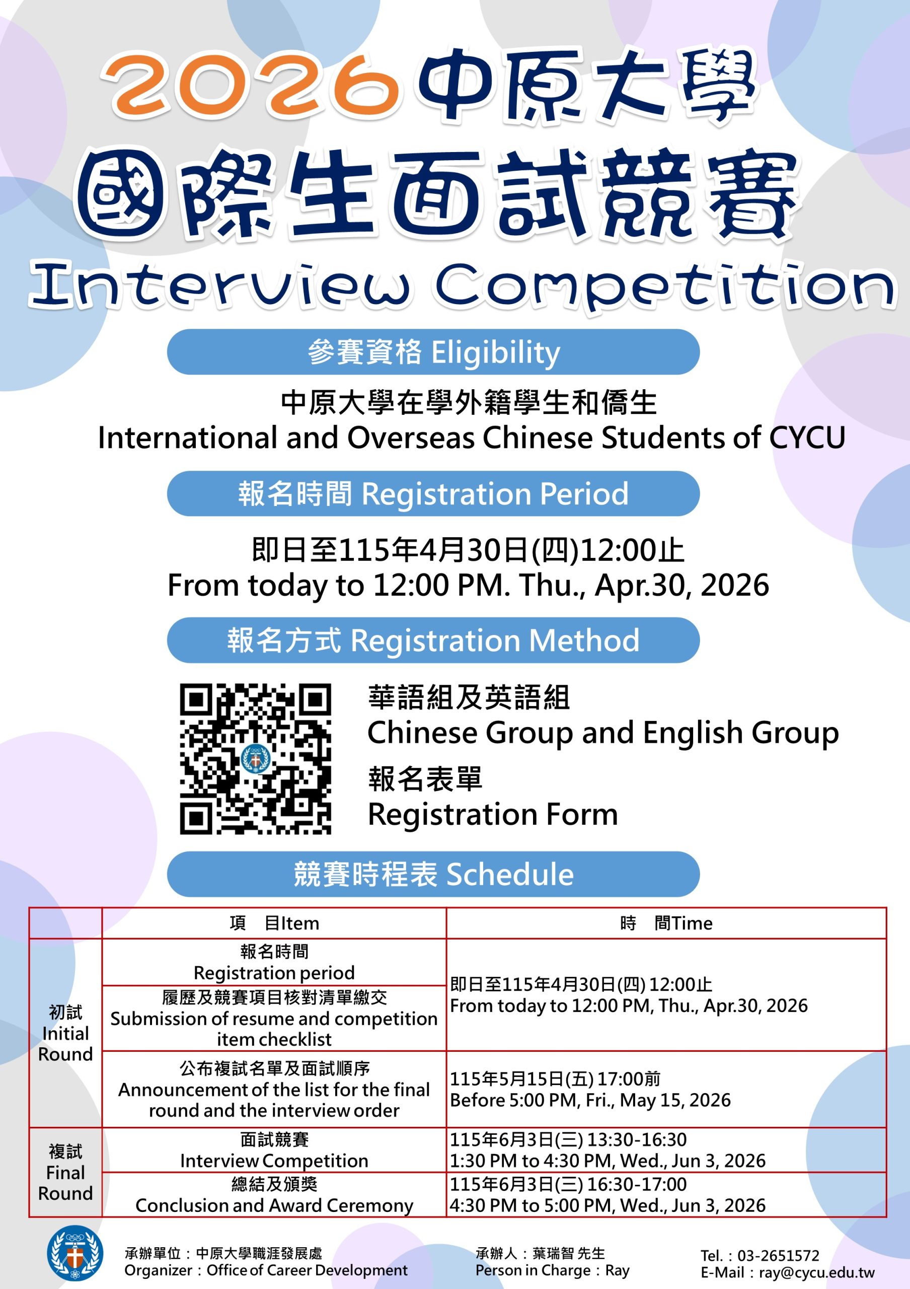 【Career Development Center Competition】 2026 Chung Yuan Christian University International Student Interview Competition — Submission Deadline: April 30, 2026. We warmly welcome eligible students to register and participate! 2026-03-02