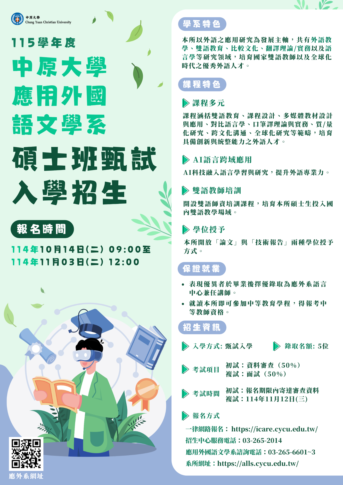 招生資訊 —— 碩士班 —— 甄試入學 ⬆︎ Designed by Freepik ⬆︎ 碩士班甄試入學 中原應外系碩士班 115學年度碩士班甄試入學招生公告【點我進入本校招生中心報名專區】 115學年度碩士班甄試入學招生簡章 更新日期:2025/09/19 Download