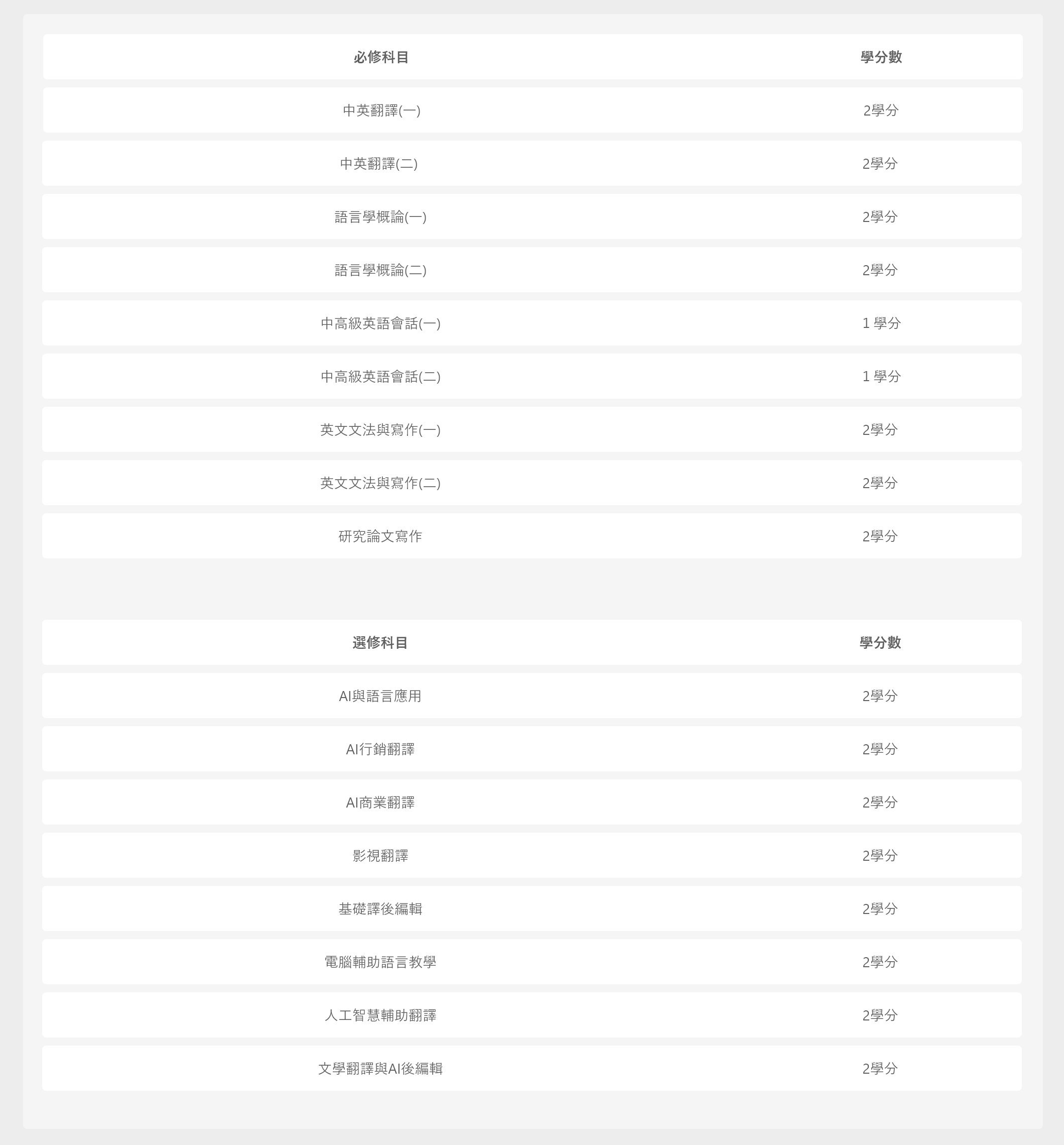 (1) 選修本學程之學生,須修滿必修科目 4 學分及選修科目至少 8學分,共計至少 12 學分。依教務處之規定於修業年限內修畢。