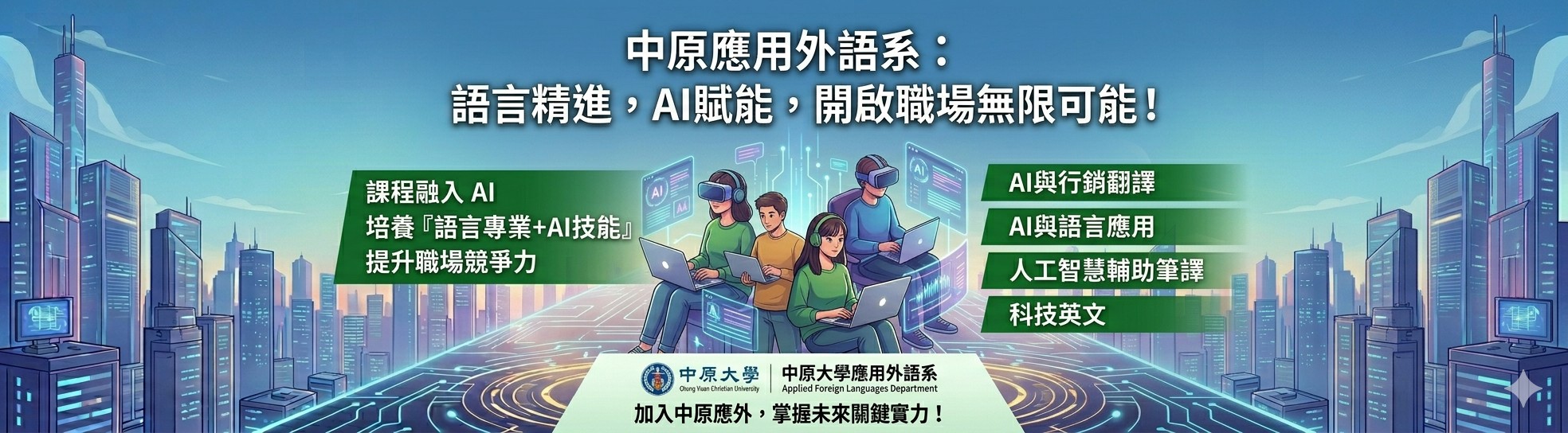 在人工智慧迅速改變世界的時代,語言已不再只是溝通的工具,而是連結科技與未來的關鍵能力,本系順應這股趨勢,將AI科技融入教學,打造跨領域學習的新模式。無論是語言學習、翻譯應用,還是國際溝通能力的培養,結合AI都能讓學習更高效、更貼近真實世界需求。